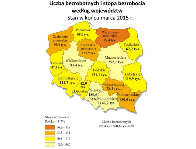 Tradycyjnie już stopa bezrobocia w skali kraju była bardzo zróżnicowana. Najwyższą stopę odnotowano w województwach: warmińsko-mazurskim (18,8%), kujawsko-pomorskim (15,8%), zachodnio pomorskim (po 15,7%), podkarpackim (14,9%) i świętokrzyskim (14,6%). Najlepsza sytuacja panowała w województwach: wielkopolskim (8%), śląskim (9,8%), mazowieckim (9,9%) i małopolskim (10,1%).