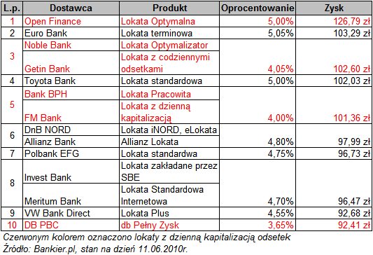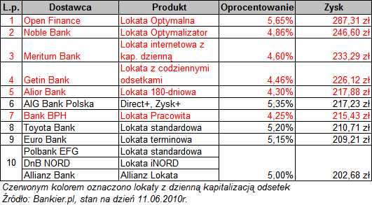 W przygotowanym przez nas zestawieniu TOP10 najlepszych lokat dla kwoty 10 tys. zł przeważają lokaty z dzienną kapitalizacją odsetek. To one, mimo niższego oprocentowania nominalnego, przynoszą wyższy zysk. W czołówce zestawienia od wielu miesięcy przewijają się te same instytucje. Obecnie liderem pozostaje firma Open Finance proponująca Lokatę Optymalną. Dla okresów 3M proponuje 5 proc., dla 6M i 12M - 5,65 proc. Niewykluczone, że jest to już jednak ostatni moment na założenie depozytu na takich warunkach. Pośrednik poinformował bowiem, że oferta lokaty będzie obowiązywała tylko do końca czerwca. Dotychczasowy główny konkurent - Meritum Bank - obniżył już oprocentowanie lokat zwiększając dystans od lidera. Mimo tego, nadal ze swoją ofertą plasuje się w czołówce najkorzystniejszych depozytów.
