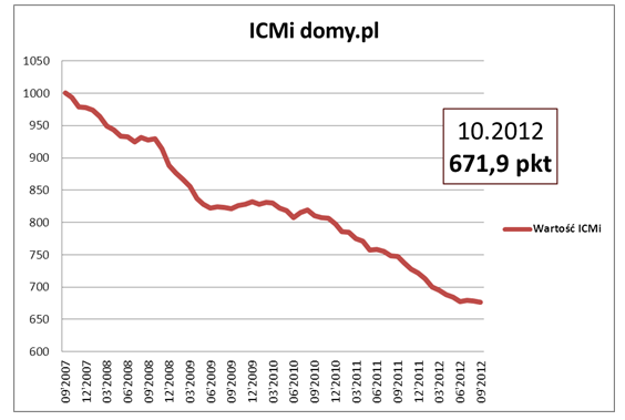 Wartość Indeksu Cen Mieszkań uwzględniającego inflację (ICMi) wyniosła w październiku 671,9 pkt. i była niższa niż we wrześniu 2007 r. o 32,8%.