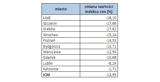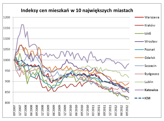 Ciekawy obraz zmian na rynku wyłania się także z danych nt. wartości indeksów dla poszczególnych 10 miast, które stanowią składową ICM. Od początku notowań (wrzesień 2007) największy spadek cen nastąpił w Łodzi (18,1%), Szczecinie (17,7%) i Krakowie (17,6%); do prawie dwukrotnie mniejszych spadków doszło w Gdańsku (10,6%) i Lublinie (8,2%). Jednak najmniejszym spadkiem indeksu, a więc najmniejszą różnicą między obecnymi cenami mieszkań a tymi sprzed nieco ponad 5 lat, może się poszczycić stolica woj. śląskiego. Indeks Cen Mieszkań w Katowicach spadł w porównaniu z wrześniem 2007 r. o zaledwie 1,7%. Taki wynik to efekt opóźnionej i bardzo krótkotrwałej fali zwyżek cen w tym mieście. O ile w trzecim kwartale 2007 r. w innych branych pod uwagę miastach bańka cenowa sięgała już zenitu, o tyle w Katowicach ceny dopiero zaczynały rosnąć.