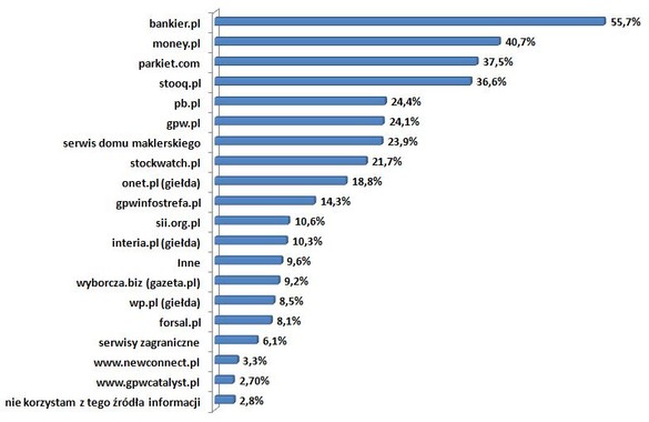 Skoro dominującym medium są portale internetowe, najważniejsze pytanie dotyczy tego, który z nich jest na rynku najpopularniejszy. W tym przypadku od kilku lat czołówka nie zmienia się, aczkolwiek warto zwrócić uwagę na dwie pozycje - lidera, który od wielu lat jest ten sam, czyli portal Bankier.pl, a także awans, jaki w ciągu ostatnich czterech lat zanotował portal Money.pl. Jeszcze w 2010 roku zajmował 4 pozycję, z wynikiem niewiele ponad 12 proc. (dokładnie 12,1), natomiast w roku 2014 awansował na pozycję wicelidera, z imponującym wynikiem 40,7 proc. Lepszy był tylko wspomniany Bankier.pl, z którego korzysta 55,7 proc. ankietowanych.