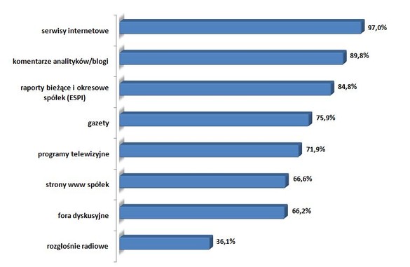 Kluczowe informacje dotyczące spółek notowanych na GPW to przede wszystkim raporty bieżące i okresowe spółek. Trzech na czterech ankietowanych ocenia tę informację jako najważniejszą. Co ciekawe, na kolejnym miejscu znalazły się wspomniane wcześniej serwisy internetowe, a na następnym miejscu strony internetowe spółek. Podobnie jak w poprzednich latach coraz niższy wpływ w tym obszarze odnotowały stacje radiowy, co zresztą nie powinno dziwić. Serwisów i audycji dotyczących giełdy jest w przestrzeni radiowej jak na lekarstwo.