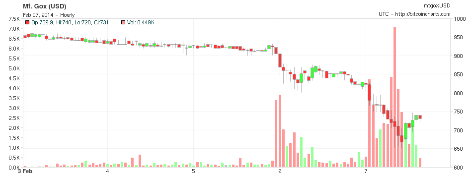 Mt. Gox, jedna z giełd handlu bitcoinem, była zmuszona do wstrzymania wszystkich operacji wymiany tej wirtualnej waluty ze względu na zwiększony ruch związany z wycofywaniem środków.