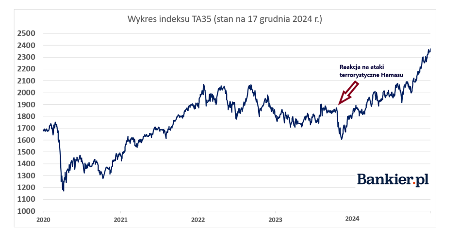 Indeks TA-35, który śledzi wyniki 35 dużych spółek notowanych na giełdach w Tel Awiwie ustanowił we wtorek 17 grudnia nowy historyczny szczyt na poziomie 2373,62 pkt.. Sesję zakończył także rekordowo wysoko na 2 367,99 pkt., rosnąc o 1 proc. i poprawiając wynik z poprzedniego tygodnia. W tym roku stopa zwrotu indeksu to już 25 proc. Od wyznaczenia kilkuletniego minimum po ataku Hamasu na Izrael w październiku 2023 r., TA-35 zyskał już 49 proc. Najwyżej w historii jest też szeroki indeks TA-125, który we wtorek wzrósł o 0,8 proc., a w tym roku także 25 proc.