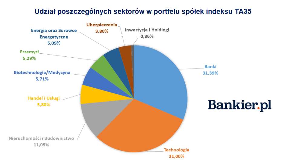 Wśród największych spółek są jeszcze banki: Leumi, Hapoalim czy Mizrahi. Sektor ten stanowi dominującą branżę w TA-35, dalej są spółki technologiczne reprezentowane m.in. przez Nice, czy Nova Measuring Instruments. W indeksie jest notowana m.in. telekomunikacyjna spółka Bezeq, którą ostatnio na „czarną listę” wpisał Norweski Fundusz Majątkowy.