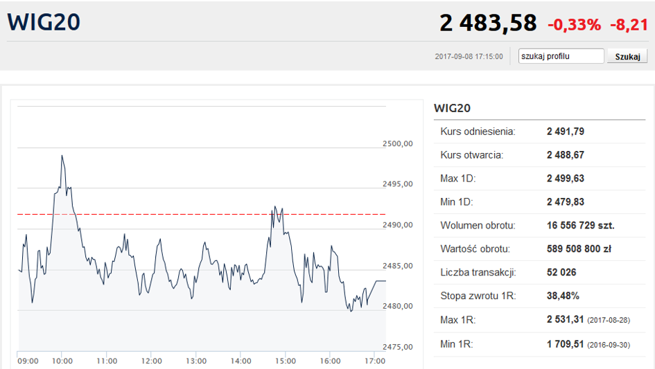 | WIG 20 | Polska | 2483,58 | -0,33 | -1,74 | 2,41 | 38,48 | 27,50 |