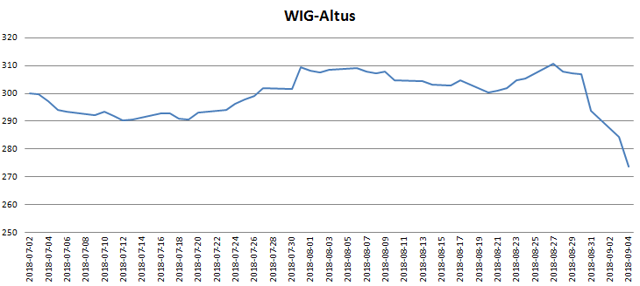 Jak sprawował się indeks? Po słabym początku lipca, na koniec tego miesiąca wspiął się on na poziom 309,3 pkt. Wynik ten udało się poprawić dopiero 27 sierpnia, gdy indeks wspiął się na poziom 310,5 pkt. To było jednak maksimum, przez kolejne trzy dni indeks osunął się do 307 pkt. Dopiero wtedy rozpoczęła się prawdziwa fala spadków. Przez ostatnie trzy sesje wartość indeksu spadła aż o 10,9 proc. "Altusowe" spółki cierpią więc wraz z Altusem.