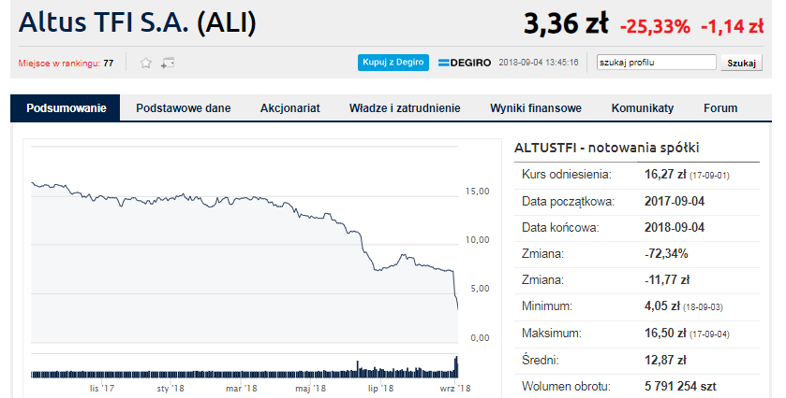 Spadki kontynuowane były i w poniedziałek, kiedy nastroje wokół spółki dodatkowo pogorszyła decyzja Norges Banku. Norwegowie wypowiedzieli Altusowi umowę, na podstawie której Altus TFI zarządzał aktywami netto - według stanu na dzień 30 sierpnia 2018 r. - o wartości 482,7 mln dolarów, czyli niemal 1,8 mld zł. Dla porównania wartość aktywów pod zarządzaniem Altus TFI na koniec lipca wynosiła 13,4 mld zł. Następnie wypowiedzenie otrzymało także Rockbridge TFI, czyli spółka zależna Altus TFI, które zarządzało dla Norwegów aktywami netto o wartości 369,9 mln USD (1,37 mld zł). Poniedziałek Altus kończył kolejne 6,3 proc. niżej. Dodatkowo po poniedziałkowej sesji Esaliens TFI poinformowało o odstąpieniu od planu połączenia z Altusem. We wtorek akcje spółki taniały o kolejne 26 proc. Łącznie od początku roku Altus stracił na giełdzie 74 proc. swojej wartości i jest obecnie notowany na najniższych poziomach w historii.