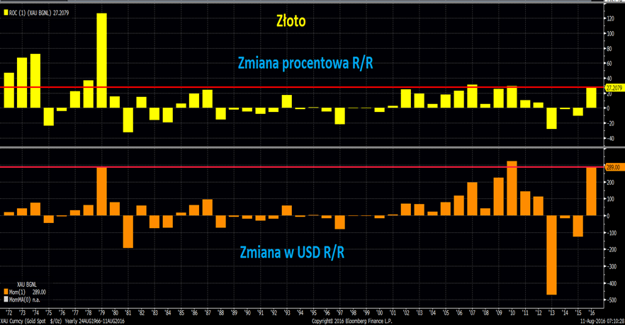 Od 1972 roku złoto tylko w 7 okresach zanotowało lepszą stopę zwrotu, natomiast w dolarach tylko w 2. Jeżeli system monetarny się nie rozpadnie, nie dojdzie do wojny, to możemy spodziewać się przerwania wsparcia 1300 USD i kontynuacji spadków.