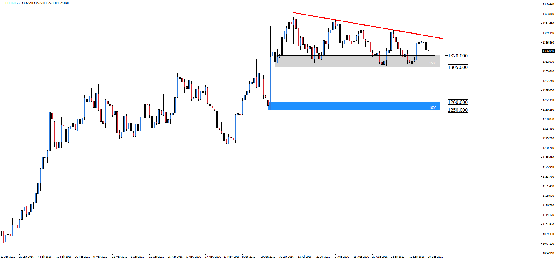 Po dużych stopach zwrotu złoto wpadło w konsolidację, notowania poruszają się w bardzo wąskim zakresie cenowym. Na wykresie dziennym niedźwiedzie w dalszym ciągu walczą z wsparciem 1305-1320, na chwile obecną bezskutecznie. Jednakże po każdym odbiciu kupujący słabną, widać to po sile impulsu wzrostowego, który jest coraz słabszy. Strona sprzedająca po takim czymś może nabrać większej pewności siebie i po chełpić się na przerwanie dziennego oporu.