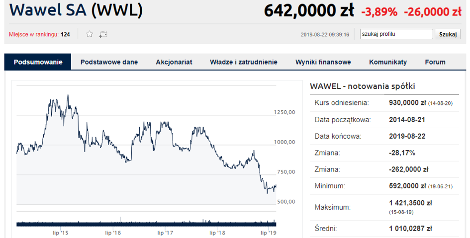 Słabość widać na notowanych na GPW akcjach Wawelu, które tylko po publikacji środowego raportu tracą w czwartek blisko 4 proc. Dziś za jedną akcje Wawelu trzeba zapłacić 642 zł, podczas gdy jeszcze na początku 2018 roku za papiery te płacono ponad 1000 zł. W ostatnim czasie szczególnie mocno Wawel taniał na przełomie marca i czerwca, gdy w trzy miesiące wycenia spółki skurczyła się o 1/3.