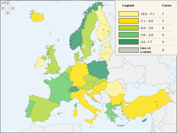 Dynamika PKB w 2009 roku w poszczególnych krajach Europy.