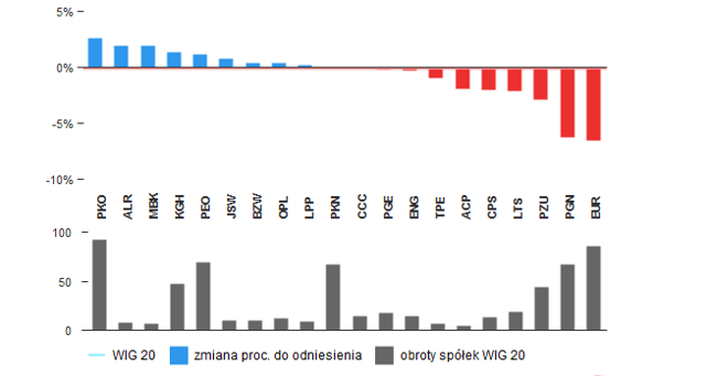 Także blue chipy miały swojego negatywnego bohatera dnia. Było nim PGNiG. Akcje gazowego giganta potaniały dziś o 6,2 proc. po słabszych od oczekiwań wynikach za III kwartał. Warto jednak zauważyć, że poważniejszym ciężarem dla indeksu - z racji większej wagi - było taniejące o 2,8 proc. PZU. Po drugiej stronie rynku wyróżniało się PKO BP (+2,6 proc.). To także efekt raportu za III kwartał. Bankowi, w przeciwieństwie do PGNiG, udało się pobić konsensus.