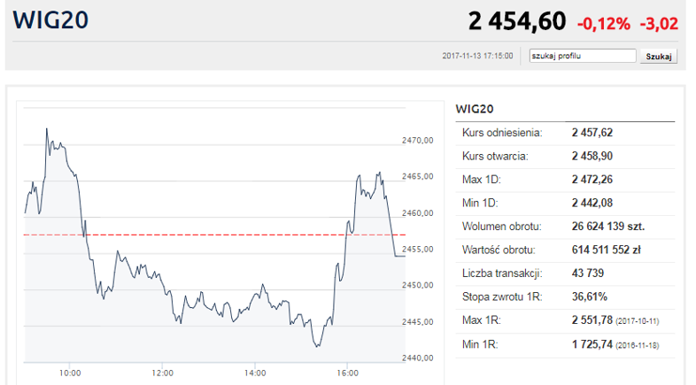 | WIG 20 | Polska | 2454,60 | -0,12 | -2,41 | -2,91 | 36,61 | 26,01 |