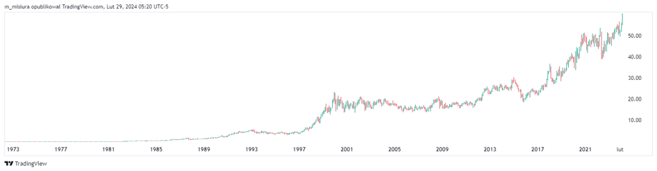 Tak jak w przypadku Mety, notowania Walmartu znajdują się w tej chwili na historycznie wysokim poziomie w okolicy 60 USD. Od początku roku kurs spółki zyskuje ponad 12%.