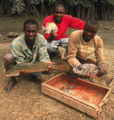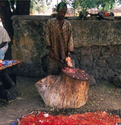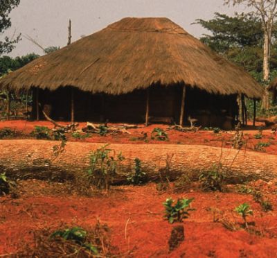 Krajobraz powoli zmienia się i po jakimś czasie przejeżdżamy przez najprawdziwszy deszczowy las podzwrotnikowy. Wydaje mi się on nieco bardziej malowniczy niż lasy, które widziałem w Ameryce Południowej czy w Azji Południowo-Wschodniej. Charakterystyczne są tu pojedyncze ogromne drzewa, górujące nad resztą roślinności puszczy. Czerwona wyboista droga co jakiś czas prowadzi przez wioski z chatami z laterytowych cegieł i trawy. Mijamy miejscowych, którzy wymachują obdartymi ze skóry, dużymi małpami, zachęcając do kupna świeżego towaru. W wioskach nasza ciężarówka co chwilę staje, żeby zabrać nowych podróżnych. Nie ma tu zwyczaju zbierania się na przystankach, każdy więc czeka przed swoim domem. Nawet w najmniejszej wiosce autobus zatrzymuje się kilka razy.