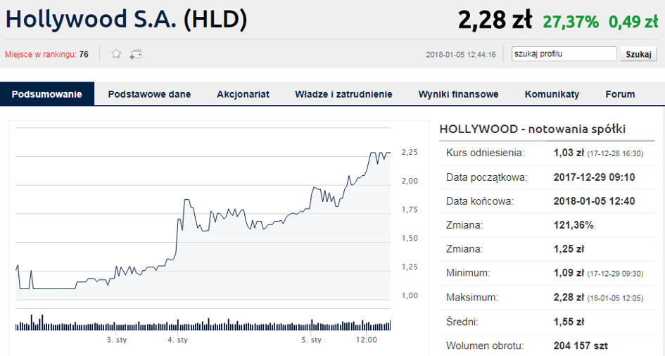 Na zamknięciu podczas ostatniej sesji na NewConnect (28. grudnia 2017 r.), akcje spółki Hollywood kosztowały jeszcze zaledwie 1,09 zł. Dziś ich cena oscyluje już w okolicach 2,30 zł, co oznacza wzrost w ciągu tygodnia o nawet nieco ponad 100 proc. (!). Regularnie, dzień po dniu, spółka znajduje się nawet ostatnio w czołówce najwyższych wzrostów na GPW. Taka zwyżka kursu szybko zwróciła uwagę inwestorów, przez co Hollywood stale pnie się także w rankingu popularności na Bankier.pl (obecnie jest już na 76. miejscu).