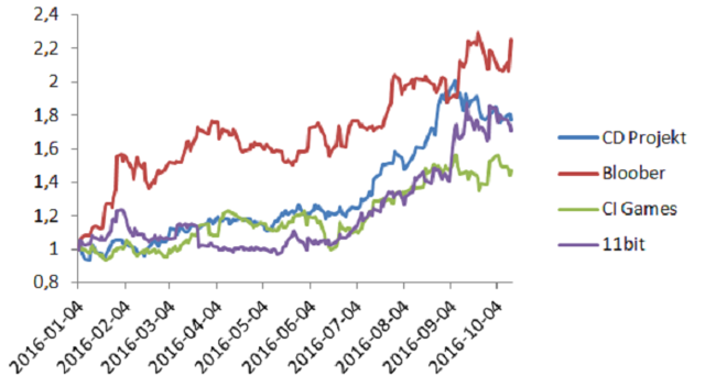 CD Projekt od początku roku zyskał na wartości 80%, CI Games umocniło się o 50%, Bloober o 118%, a 11bit o 71%. Te wzrosty robią wrażenie, tym bardziej, że dla większości wymienionych spółek rok 2016 nie jest pierwszym rokiem, w którym ich akcje drożeją. Hossa ta ma związek z sukcesem już opublikowanych tytułów ("Wiedźmin 3", "This War of Mine", "Layers of Fear"), ale także i z nadziejami na dobre przyjęcie nowych produkcji ("Gwint", "Frostpunk" czy "Sniper 3").