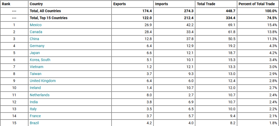 Jeśli chodzi o towary importowane do USA, aż 15,4% sprowadzanych towarów pochodziła z Meksyku, 13,8% z Chin, a 12,2% z Kanady. Jednocześnie są to także największe rynki zbytu dla amerykańskich towarów. Do Kanady trafia 16,3% eksportu USA, 15,4% odbiera Meksyk, a Chiny odpowiadają za 7,3%.
