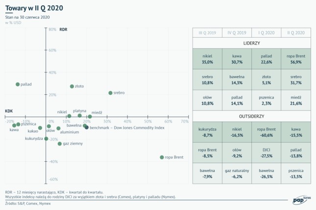 20-proc. zyskiem zakończył II kwartał 2020 roku DJ Commodity Index, obrazujący koniunkturę na rynku towarów. Największy wpływ na zwyżkę indeksu miał wzrost cen ropy o niemal 60 proc. - wynika z raportu IRR Quarterly przygotowanego przy współpracy PAP Biznes. Wzrosły również ceny większości kruszców, a złoto znalazło się najwyżej od 2011 roku.
