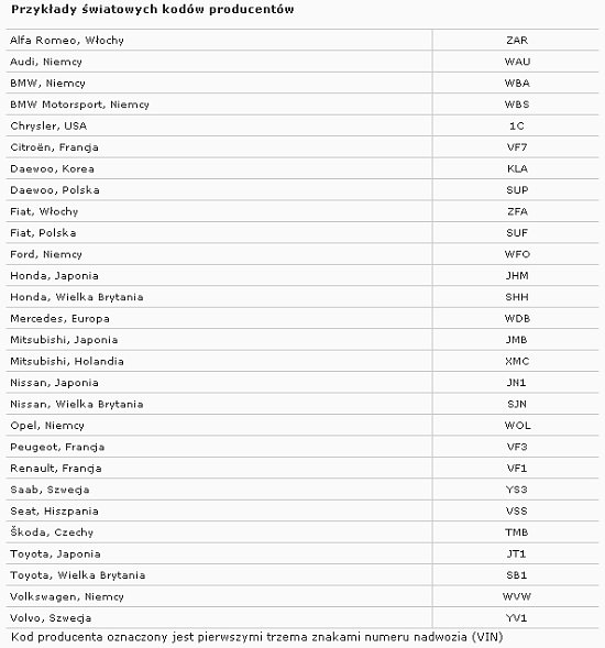 Trzy pierwsze znaki określają międzynarodowy kod producenta, w którym pierwszy znak to rejon geograficzny, drugi znak to kraj w określonym rejonie, trzeci znak to producent pojazdu.