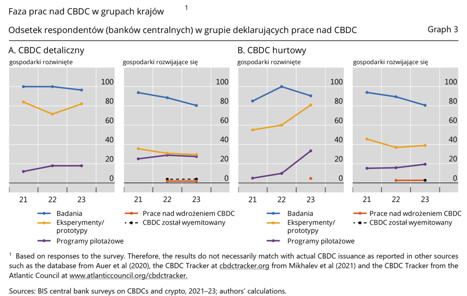 BRM zwraca uwagę, że tempo prac i ich zaawansowanie wygląda inaczej w grupie krajów rozwiniętych gospodarczo i krajach rozwijających się. W tych pierwszych nastąpił zdecydowany wzrost zainteresowania hurtową wersją CBDC (wholesale CBDC). W 2023 r. 81 proc. banków centralnych „odhaczyło” etap tworzenia prototypu, a 33 proc. prowadziło pilotaże. Rok wcześniej było to odpowiednio 60 i 10 proc.