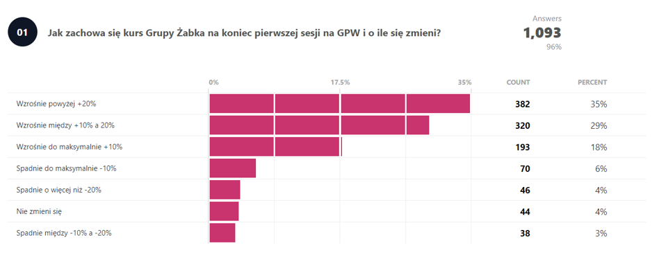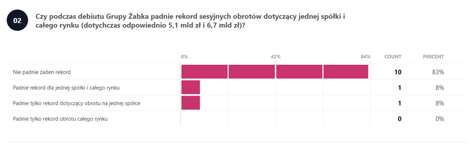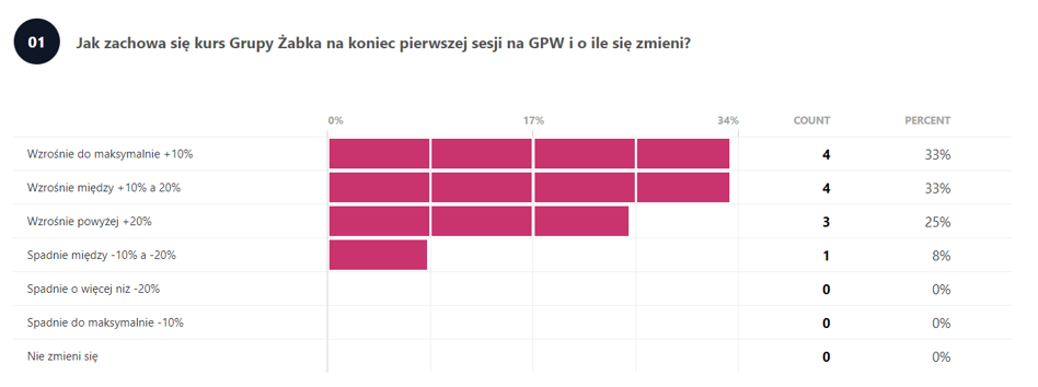 Wyniki ankiety zdają się potwierdzać duży optymizm przed debiutem Żabki, bowiem blisko 92 proc. ankietowanych, czyli 11 osób uważa, że kurs wzrośnie. Z czego ponad połowa sądzi, że będzie to wzrost o co najmniej 10 proc. lub więcej. Spadek kursu na pierwszej sesji prognozuje tylko jedna osoba.