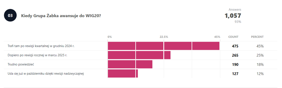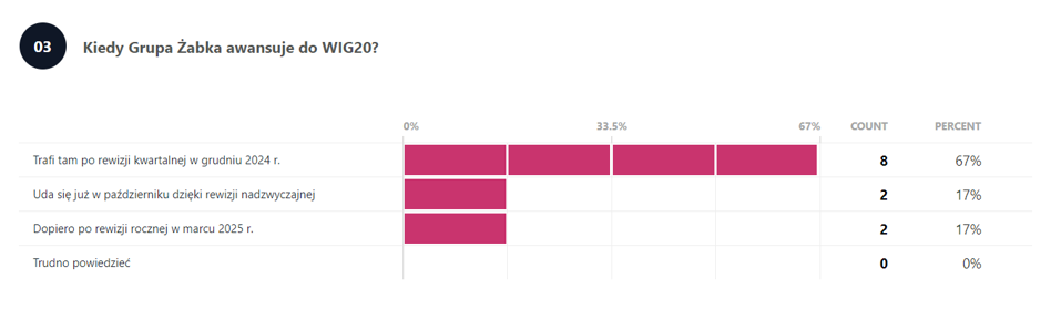Co do rekordów, o których była mowa wyżej, większość uważa, że żaden z tych dotyczących debiutu PZU nie zostanie pobity, a tylko dwie przewidują, że rekordy padną. Ma to swoje przełożenie w odpowiedziach na pytanie kiedy Grupa Żabka trafi do WIG20, bo tylko dwie osoby zakładają, że stanie się to już w październiku w ramach rewizji nadzwyczajnej. Większość sadzi, że spółkę w WIG20 zobaczymy dopiero w grudniu po rewizji kwartalnej, a niektórzy, że nawet później.