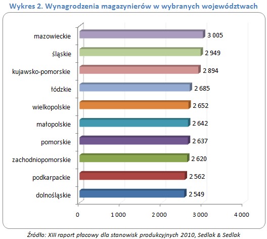 Jak pokazują dane XIII raportu płacowego dla stanowisk produkcyjnych 2010 firmy Sedlak & Sedlak, mediana wynagrodzenia całkowitego magazynierów wyniosła 2651 PLN brutto. Zarobki co czwartego zatrudnionego na tym stanowisku przekroczyły 3 152 PLN. Płaca podstawowa pracowników magazynu kształtowała się na poziomie 2 400 PLN. Wynagrodzenie zmienne wyniosło przeciętnie 283 PLN i stanowiło 11% całkowitych zarobków. W przypadku jednej czwartej magazynierów przekroczyło 691 PLN (32%).