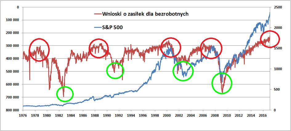 Kwestią pierwszorzędną jest fakt, że wieloletnie minima w statystykach „świeżych bezrobotnych” wielokrotnie poprzedzały wieloletnie maksima na S&P 500. Wystarczy spojrzeć na wykres i odnaleźć rok 1973, 2000 czy 2006/07. Nie jest to co prawda żelazna prawidłowość: w roku 1978, 1988 czy 1993 po wieloletnich minimach „claimsów” S&P 500 nadal szedł w górę. Lepszą skuteczność ma sygnał kupna akcji przy wysokich stanach podań o „kuroniówkę”. Kto kupił amerykańskie akcje w roku 1982, 1991, 2001 czy 2009, ten potem nie żałował.