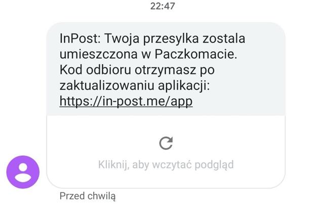 - InPost: Twoja przesyłka została umieszczona w Paczkomacie. Kod odbioru otrzymasz po zaktualizowaniu aplikacji: https://in-post[.me]/app - przeczytamy w treści wiadomości.