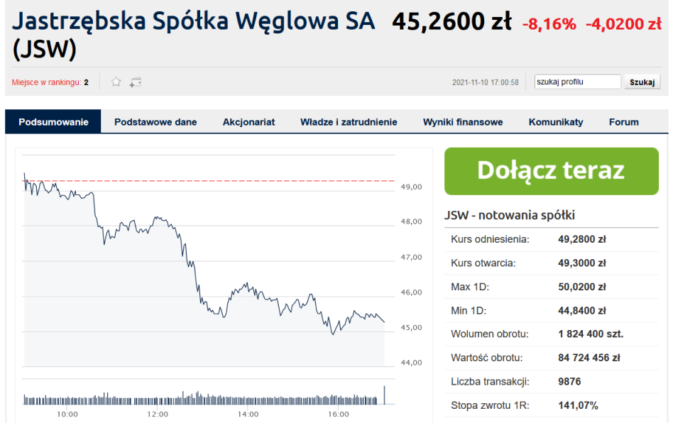 Zdecydowanie nie był to dzień dla JSW. Kurs zanurkował aż o 8,16 proc., co było największym spadkiem wśród dużych spółek przy obrotach blisko 85 mln. Kurs jest najniżej od września, kiedy rozpoczęła się węglowa hossa.