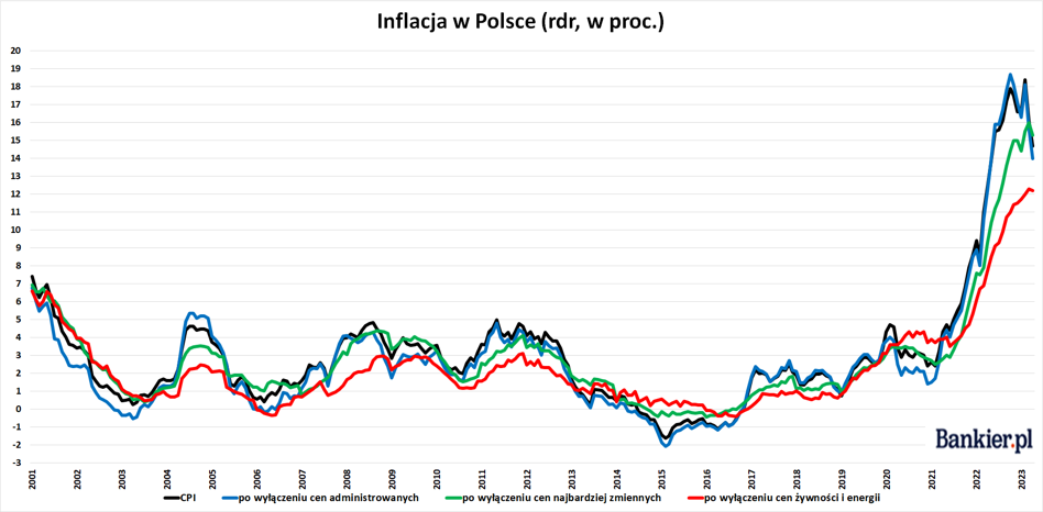 - tzw. 15-proc. średnia obcięta, która eliminuje wpływ 15 proc. koszyka cen o najmniejszej i największej dynamice, 14,3 proc. wobec 15,5 proc. miesiąc wcześniej.