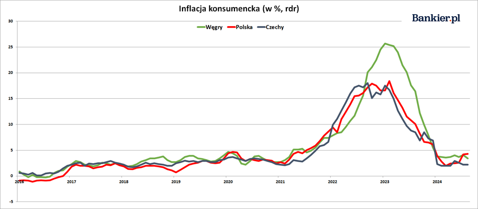 Dzięki sierpniowej obniżce rocznej dynamiki CPI znów możemy mówić o dezinflacji na Węgrzech. Wcześniej od początku 2024 roku inflacja CPI na Węgrzech już nie maleje po bardzo silnym spadku w roku ubiegłym (z przeszło 25% do niespełna 4%). Co gorsza, stosunkowo wysokie były też miesięczne przyrosty indeksu cen dóbr konsumpcyjnych. Jeszcze w lipcu wzrósł on o 0,7% mdm. Ale w sierpniu pozostał na tym samym poziomie co w lipcu (0,0% mdm).