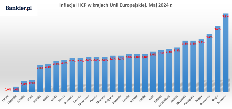 Podobnie jak w poprzednich miesiącach niechlubny tytuł inflacyjnego lidera Europy dzierży Rumunia, gdzie w maju inflacja HICP wyniosła 5,8%. Na podium uplasowały się Belgia (4,9%) przed Chorwacją (4,3%). We wszystkich pozostałych krajach UE ta miara wzrostu cen nie przekraczała 4% i na ogół mieściła się w przedziale 2,0-3,9% (20 z 26 krajów członkowskich).