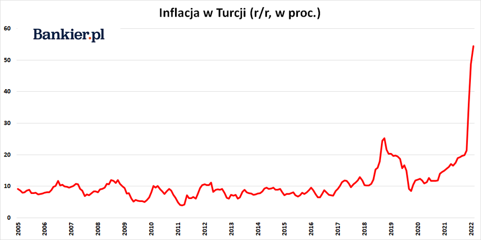 Oficjalna inflacja CPI w Turcji przekroczyła 50% i osiągnęła poziomy charakterystyczne dla krajów upadłych. Niezależne od tureckich władz źródła podają, że faktyczne tempo spadku siły nabywczej liry jest przeszło dwa razy szybsze.