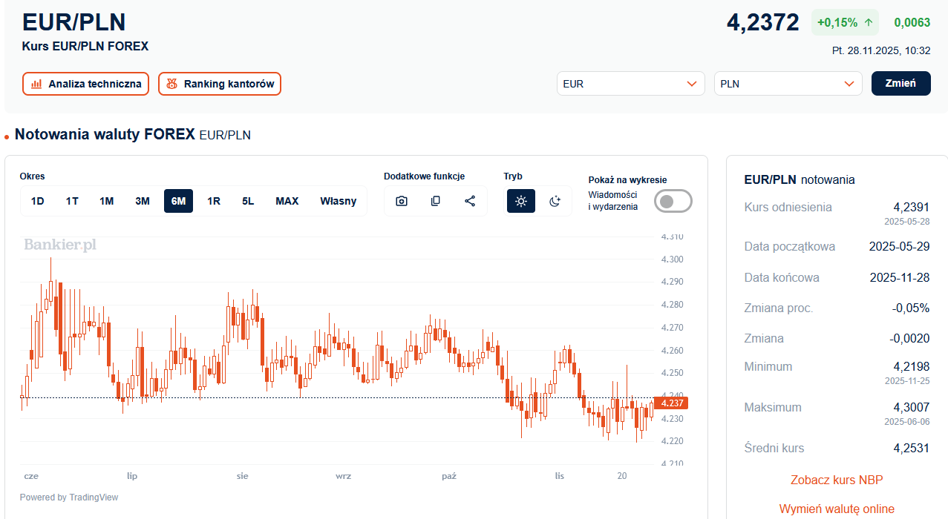 Jednakże ta generalnie dobra wiadomość z polskiej gospodarki na krótką metę osłabiła nam złotego. W piątek o 10:20 kurs euro rósł o 0,7 grosza, wspinając się na wysokość 4,2378 zł. Dla złotego perspektywa niższych stóp procentowych w Polsce oznacza mniejszą atrakcyjność dla zagranicznych inwestorów. Taka sytuacja może uniemożliwić przełamanie strefy 4,22-4,23 zł, która stanowi kluczowe średnioterminowe wsparcie dla kursu EUR/PLN.