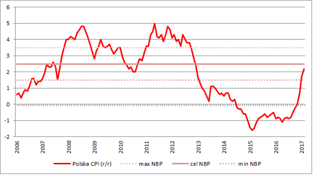 Najnowsze dane GUS-u wskazują, że inflacja CPI znalazła się najbliżej celu inflacyjnego Narodowego Banku Polskiego od końca 2012 r. Mimo to Rada Polityki Pieniężnej zachowuje zimną krew, wierząc, że wzrost inflacji (ze względu na wspomniane efekty statystyczne oraz brak silnej presji inflacyjnej w polskiej gospodarce) wyraźnie wyhamuje w drugiej połowie roku. Co więcej, najnowsze projekcje banku centralnego wskazują, że roczna dynamika wzrostu cen nawet w 2019 r. nie przekroczy 2,5%.