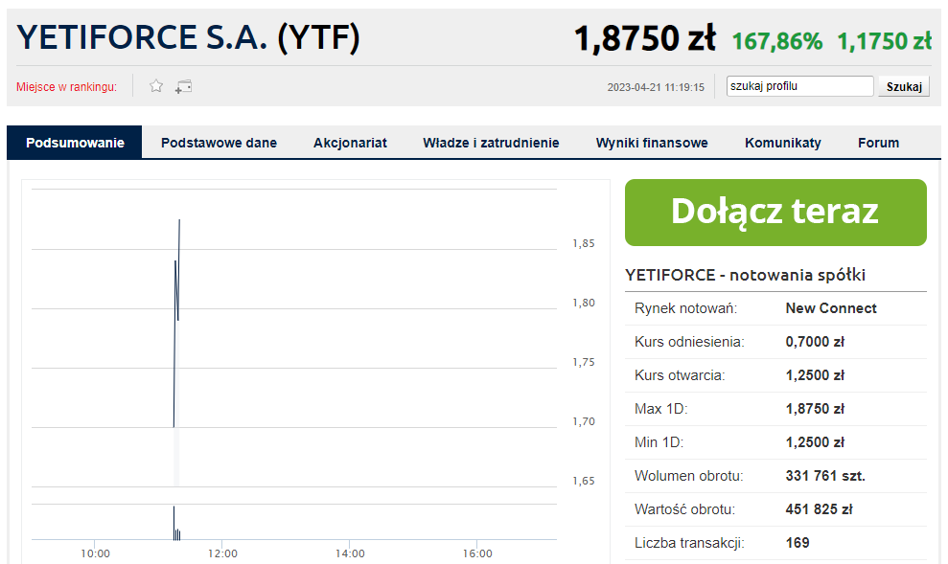 Spółka YetiForce zadebiutowała na NewConnect z ogromnym wzrostem kursu. Specyfika pierwszego dnia notowań akcji na rynku alternatywnym sprawiała, że akcje drożały w trzycyfrowym tempie. To kolejna spółka z branży IT debiutująca w ostatnich dniach z ogromnym zainteresowaniem inwestorów. W historii NewConnect kurs jednej ze spółek zyskał ponad 600 proc.