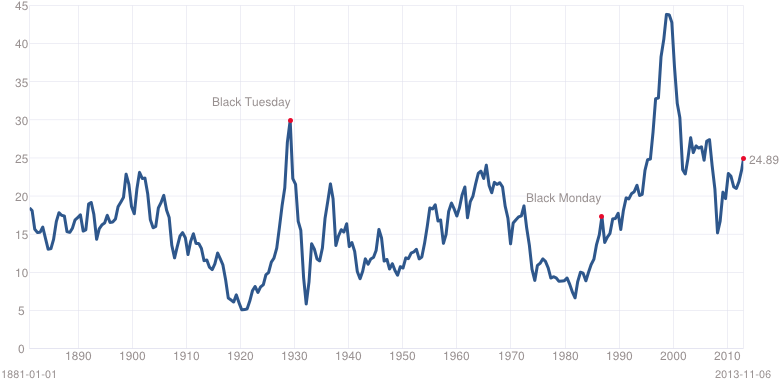 Jest jeszcze drożej, jeśli spojrzeć na wycenę względem wyników historycznych. Obecnie indeks S&P500 notowany jest po 19,5-krotności zysków za ostatnie 12 miesięcy. W ciągu ostatnich 142 lat mnożnik ten bywał wyższy głównie w okresach poprzedzających spektakularne załamania kursów akcji (1907, 1929, 2000, 2008). A jeśli zestawimy indeks S&P500 z uśrednionymi zyskami za ostatnie 10 lat skorygowanymi o inflację, to tak liczny C/Z wynosi aż 24,9, co nasuwa obawy giełdowym krachem w 2014 roku.