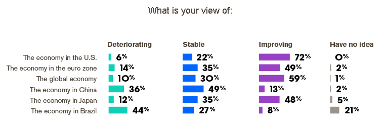 Ankietę przeprowadzono w dniach 16-17 stycznia na grupie 477 inwestorów, analityków i traderów korzystających z profesjonalnych terminali Bloomberga. Przewaga optymistów okazała się miażdżąca. Aż 72% respondentów oczekuje poprawy koniunktury gospodarczej w USA. Perspektywy dla strefy euro pozytywnie oceniło 49%, Japonii 48%, a dla globalnej gospodarki 59%. To najwyższe wyniki w 5-letniej historii tej ankiety. Dwie trzecie respondentów jest bardziej przekonana do swych prognoz niż rok temu.