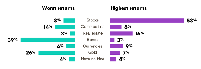 Logiczną konsekwencją optymistycznych prognoz gospodarczych jest dominujące przekonanie o kontynuacji hossy na rynkach akcji. 53% specjalistów zakłada, że w ciągu roku najwyższą stopę zwrotu przyniosą inwestycje w akcje. Drugie miejsce przypadło nieruchomościom (16%), a tylko 3% obligacjom i 7% złotu. Te dwie klasy aktywów cieszą się za to najgorszym sentymentem: 39% ankietowanych uważa obligacje za najgorszą lokatę kapitału. W przypadku złota odsetek ten wynosi 26%, zaś akcji tylko 8%.