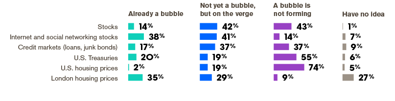 O sile pozytywnego sentymentu do ryzykownych aktywów świadczy też podejście do kwestii istnienia bańki spekulacyjnej na poszczególnych rynkach. Tylko 38% ankietowanych dostrzega bańkę w sektorze akcji spółek internetowych. Rok temu takie obawy wyrażało 49%. W przypadku amerykańskiego rynku akcji istnienie bańki wyklucza 43% ankietowanych, 42% uważa, że jeszcze jej nie ma, a tylko 14% jest przekonana o jej istnieniu. Podobnie prezentują się statystyki dla również mocno przewartościowanych obligacji śmieciowych oraz amerykańskich papierów skarbowych.