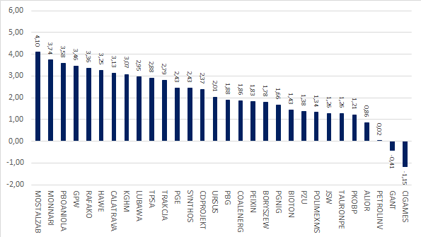 Po raz pierwszy najwyżej notowanym przedstawicielem głównego indeksu jest nie TPSA (2,30), lecz KGHM (3,12). Miedziowy gigant jeszcze nigdy nie znalazł się w zestawieniu aż tak wysoko. W sumie w czołowej trzydziestce zmieściło się 9 przedstawicieli WIG30.