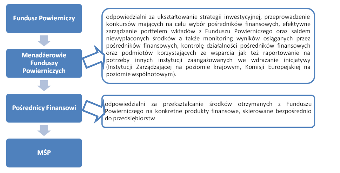 Inicjatywa Jeremie wdrażana jest w Polsce przy wykorzystaniu regionalnych programów operacyjnych. Środki dostępne w jej ramach stanowią wyodrębnioną część programów regionalnych, przeznaczonych na szeroko rozumiany rozwój przedsiębiorczości. Co ciekawe, Polska jest jedynym krajem spośród nowych członków UE, który zdecydował się na wdrażanie inicjatywy na szczeblu regionalnym. Schemat wdrażania inicjatywy zakłada w pierwszej kolejności przekazanie środków z RPO do wyodrębnionego Funduszu Powierniczego, który jest zarządzany przez wyspecjalizowany podmiot - Menadżera Funduszu Powierniczego. Następnie Menadżer Funduszy Powierniczych, zgodnie ze swoją strategią inwestycyjną, dokonuje w trybie konkursowym wyboru pośredników finansowych (mogą nimi zostać banki, fundusze pożyczkowe i poręczeniowe, fundusze venture capital itp.), do których przekazywane są środki zgromadzone w Funduszu Powierniczym.