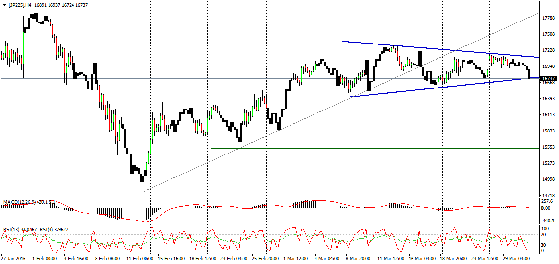 Kontrakt na japoński indeks Nikkei spadł do 16737 pkt., czyli do ważnego wsparcia jakie tworzy dolne ograniczenie formacji trójkąta na wykresie w kompresji H4. Po tym jak wcześniej została pokonana linia trendu wzrostowego, a na podstawowych wskaźnikach sytuacja systematycznie się pogarsza, istnieje duże zagrożenie wybicia dołem ze wspomnianej formacji. To zaś oznaczałoby spadek do minimum 15800 pkt.