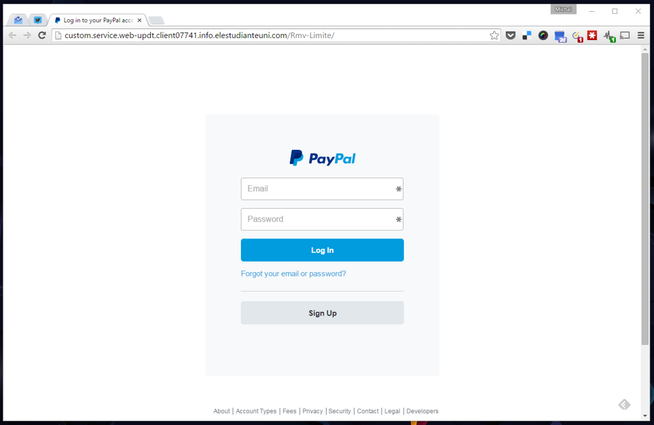 Link w mailu prowadził do podrobionej strony logowania do serwisu PayPal. Graficznie serwis był dokładną kopią oryginału. Warto jednak zwrócić uwagę na czytelne sygnały oszustwa – niewłaściwy adres serwisu oraz brak szyfrowanego połączenia (ikonki kłódki w pasku adresu, którą powinna poprzedzać nazwa firmy posiadającej certyfikat EV SSL).