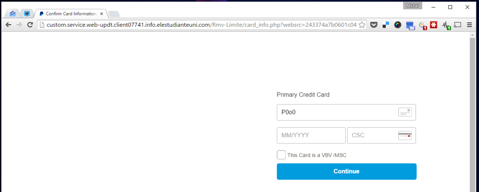 Na następnym ekranie okazało się, że to nie koniec. Teraz zostałem poproszony o wypełnienie formularza dotyczącego podstawowej karty płatniczej połączonej z kontem PayPal. Oszuści poprosili przy okazji o interesującą ich zapewne bardzo informację – czy transakcje potwierdzane są dodatkowym hasłem. Temu służy pole wyboru „VBV/MSC”. Skróty oznaczają odpowiednio „Verified by Visa” i „MasterCard SecureCode”.