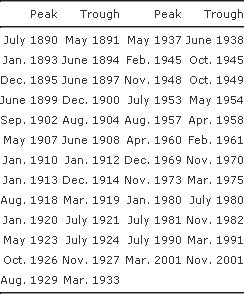 Tabela pokazuje szczyty i dołki cykli koniunkturalnych w Stanach Zjednoczonych w latach 1890-2004. Widać wyraźnie, że długość trwania poszczególnych cykli nie jest jednakowa. W ciągu ostatnich kilkudziesięciu lat średnia długość trwania cyklu wynosi około 6 lat.
