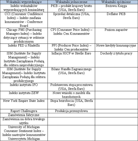 Zasadniczo wskaźniki makroekonomiczne można podzielić na trzy rodzaje: wyprzedzające, jednoczesne i opóźnione w stosunku do zmian na rynkach inwestycyjnych. Z oczywistych powodów najbardziej interesujące są wskaźniki wyprzedzające rynek przynajmniej o miesiąc (wszystko zależy również od tego, z jakim opóźnieniem dane są publikowane), sygnalizują bowiem zmiany przed ich powszechnym uwidocznieniem się. Obserwacja wskaźników jednoczesnych pozwala inwestorowi na potwierdzenie bieżącego trendu. Natomiast wskaźniki opóźnione mogą być jedynie ciekawostką historyczną.